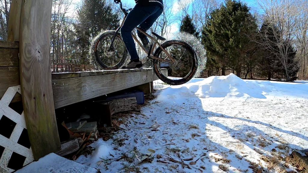 Of course it’s still winter, so the weather isn’t the best for trials riding. A blizzard pounded us last week, followed by rain, sleet, and more snow throughout the week, leaving ice and crusty snow everywhere. Regardless, despite being in the low 20’s (Fahrenheit) this afternoon, it was sunny and gorgeous out. I decided to take out my Inspired Arcade and try some easy lines and moves.