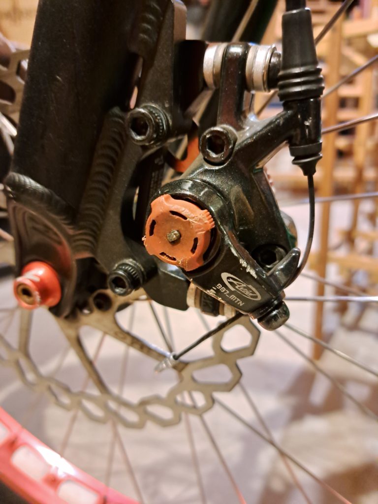 Alex gave me his Avid BB7 mechanical disc brake to replace my Echo brake after he swapped the disc for a front rim brake, so it has a some normal wear and tear, but works great. The Echo TR disc brake just doesn’t have the same stopping power. I already rebuilt it once when the seals leaked, but I still didn’t like it. Additionally, it was a pain to get it adjusted to where I wanted it, and the retainer pin for the lever will not stay in (the set screw constantly backs out). One of the things I love about the Avid brake is that the distance each brake pad from the rotor is independently adjustable, so you don’t need to mess around with shims. Since they’re mechanical, they don’t need to be bled and can’t leak. I love these things!