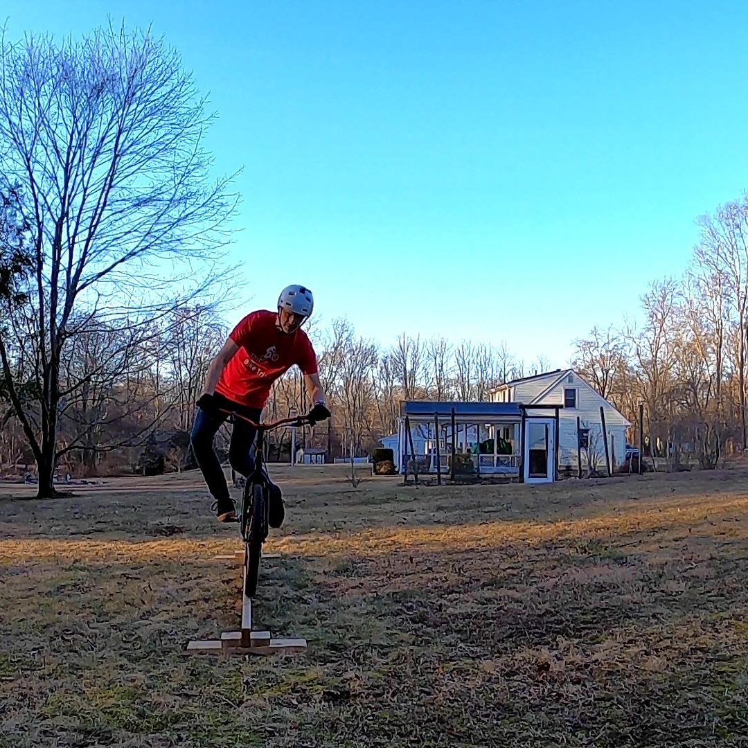 I started with some pedalups, then some skinnies, and finally, some moves on a massive pallet that looks like a section of train tracks (but much narrower). The pedalups gave me more trouble than I had anticipated, but I did manage to get one that was pretty solid. I surprised myself on the wobbly 2×4 skinny beam. That usually requires many attempts, especially (ironically) when the camera is going. But this time I was able to nail it in both directions with only a handful of attempts. The “train track” pallet was fun, but I could not quite do what I wanted to do, since the distance between the “rails” is less than my wheelbase, making it really awkward. regardless, I tried a couple of techniques to gap it. The gap distance is really easy since it’s so narrow; the trick is the setup – and like on any rail, making sure your rear wheel isn’t behind the rail when you launch. Thankfully this rail has no real consequences for that little blunder.