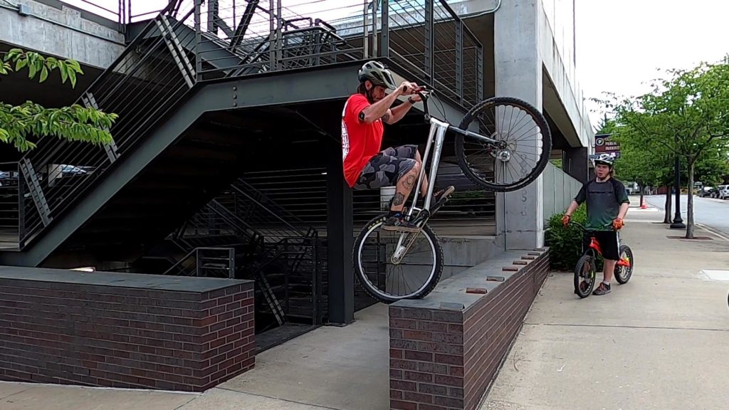 The ride started near the public parking area, with a session on the famous metal “paper airplane” sculpture, then migrated towards the park in the center of town, stopping to session a handful of other spots along the way. Surprisingly, we only got kicked out of one spot. As with my local trials crew group rides, this one included good riding and plenty of goofing around, like Seba’s “boon” gaps. (If you’re unfamiliar with the term “boon”, check out The Shin Dig – you’ll hear them mention it frequently. Essentially it’s hopping without using any pedal kick.) There were also a few really sick lines, like Seba’s manual to hop up, to gap, to drop and Debi’s hop onto a wobbly trash bin.