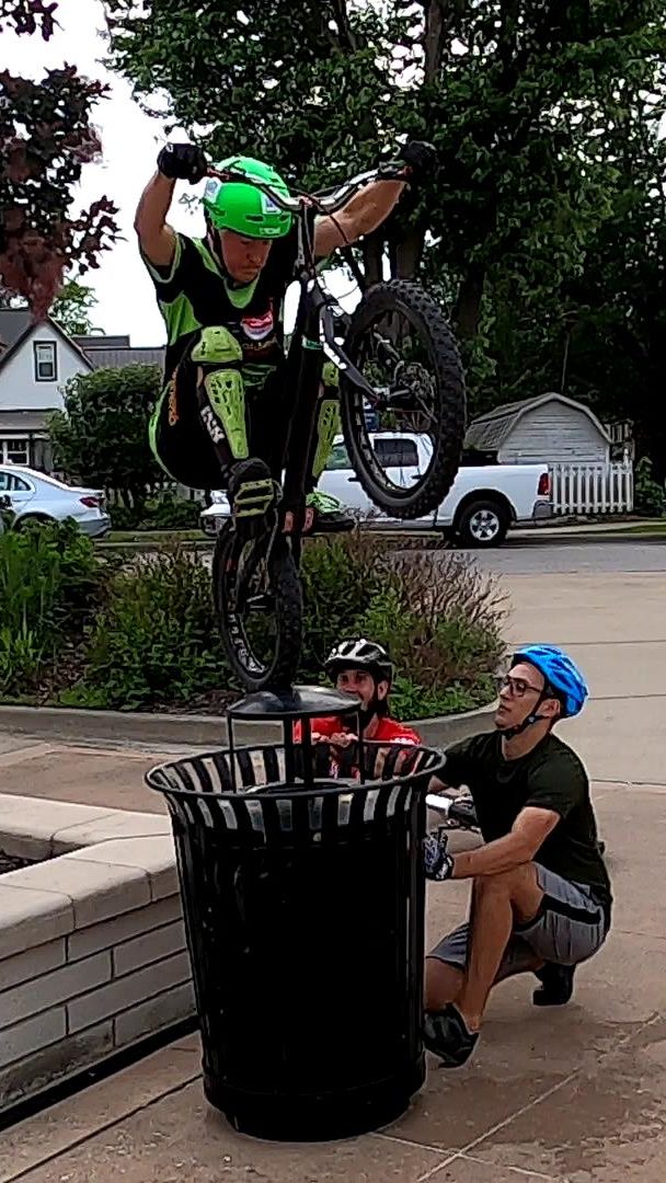 I flew out to Bentonville on Wednesday, May 24th in order to get out there and get settled, put my bike together (had to disassemble to ship it), and get a little riding in before Saturday’s trials competition. Several of us that were staying together in an AirBnB headed over to the Bentonville Bike Fest trials area Thursday to help set up for the competition do some riding. That afternoon, Debi Studer appeared with some friends, including trials riders from Switzerland and France. Apparently her trials bike had been lost on the flight over, but it had finally been located, so she was ready to get in some practice. After greeting us, she invited us to join her and he friends on a group ride in downtown Bentonville. This was actually my first street ride, so I was looking forward to it.