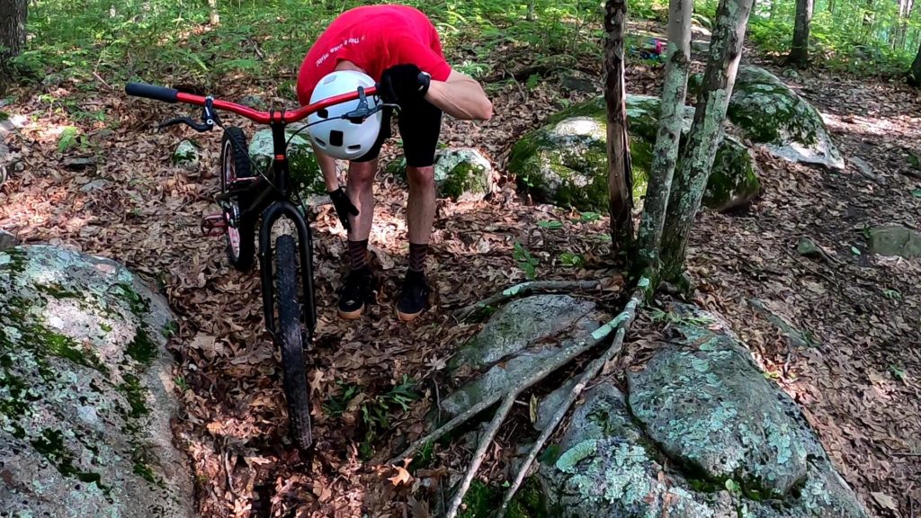 One of the first lines we spent a good deal of time on seemed like it was an intermediate (“Sport” class) level line. It was low to the ground and not too long. After spending some time on on, we realized it might actually require expert level skills to clean it. The first rock wasn’t bad, but to get onto the second rock, you had to fight a small tree. Once you’re up on the rock, there is no room for the rear wheel, and the front tire has no good place to be… and the rock is off-camber. The objective was to get from that horrible rock to another set of rocks, but we could not quite get that far. So, we decided to ride the 2nd set of rocks in the line separately. We both got up (the hard part) and then botched it. Oh well.