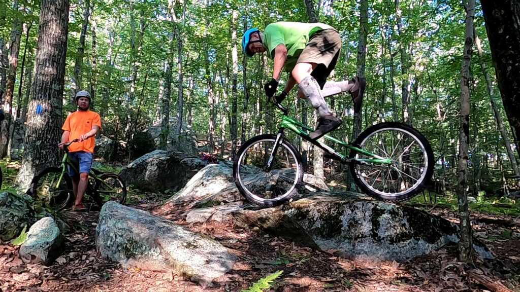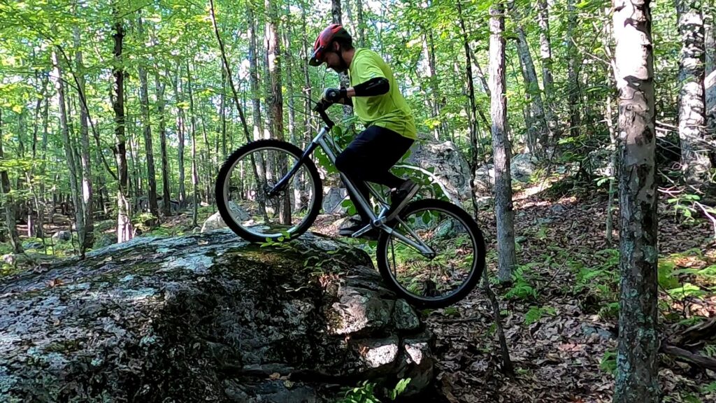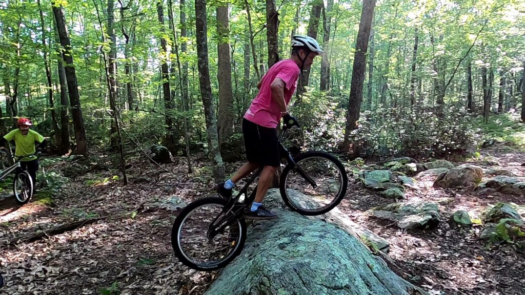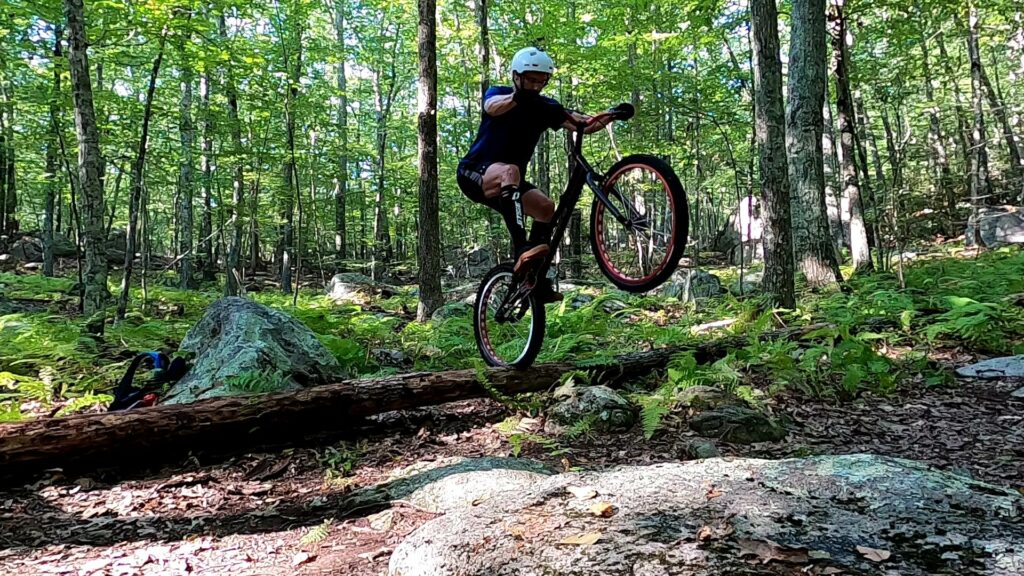 Tony also experimented with a new approach (a “cheat” in his words) to getting up a tall obstacle with a static move when your front wheel is part way up the obstacle but the rear wheel is right against it. He was able to unlock the move after a few attempts, though I struggled to dial it in.