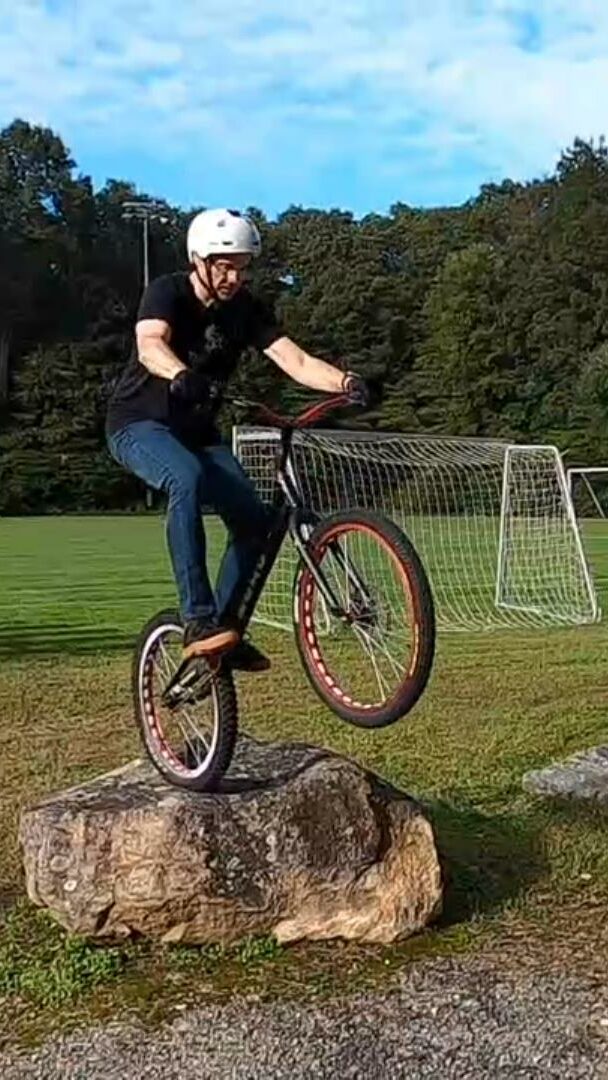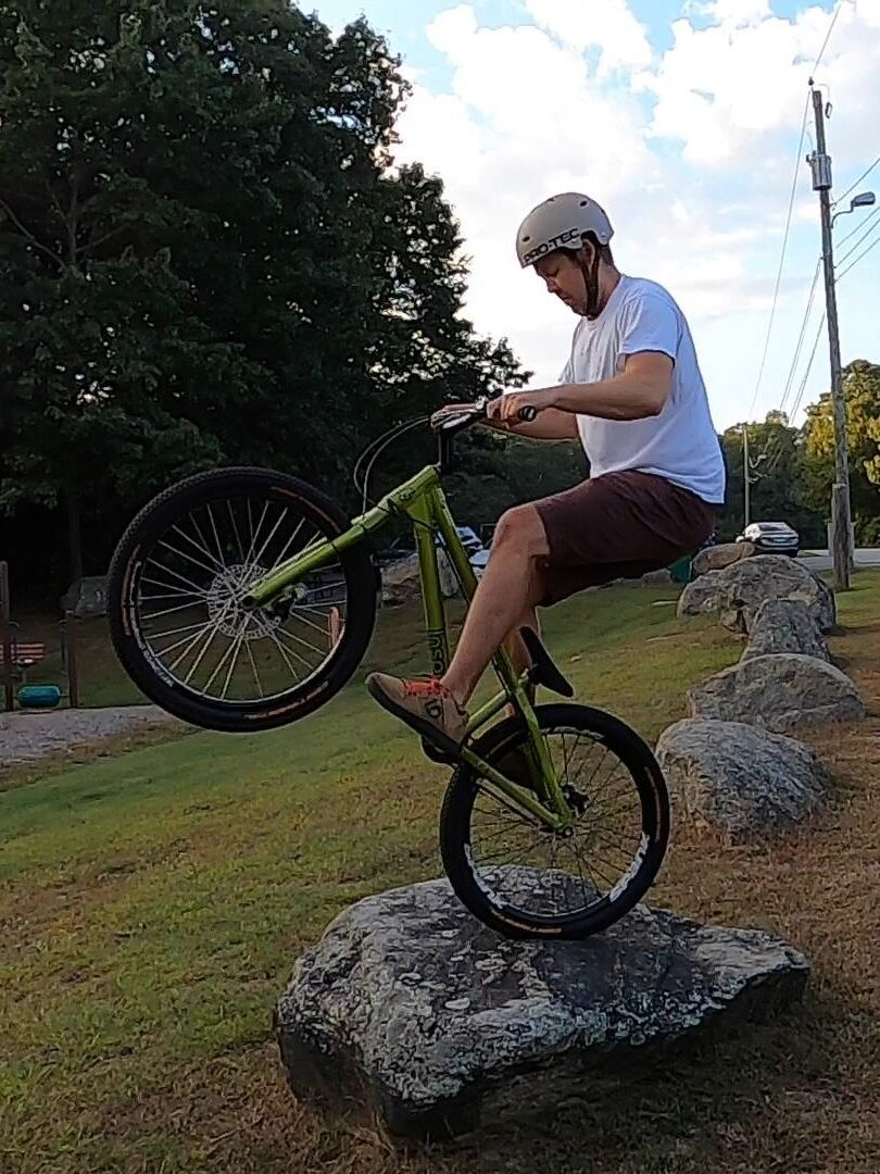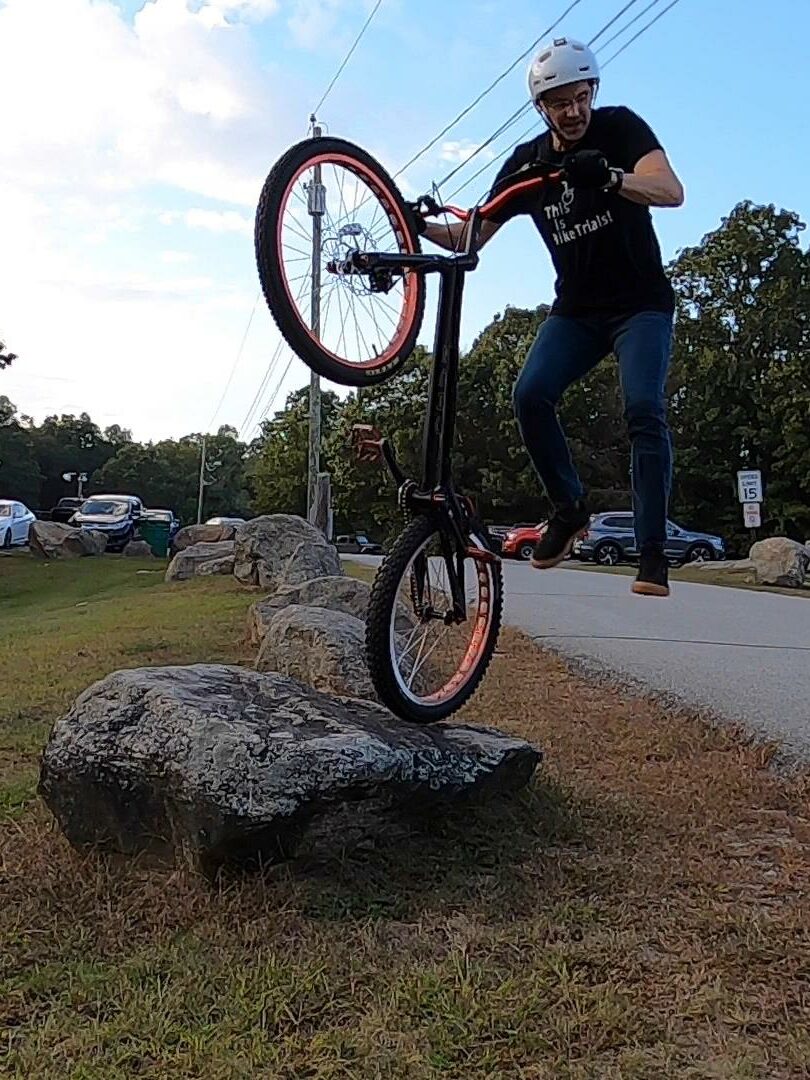 We also spend a good deal of time trying to do a static gap from the edge of the pavement up to the top of a rock that was just close enough to rest your front wheel on while still having the rear wheel on the street. This was also a bit of a struggle for all of us, though Tony finally pulled it off. I can make the gap distance, but not going up. Maybe if I rebuild some of the lost strength in my legs. That and improve my technique. Jim was pretty close to doing it in two-wheel mode. It’s a pretty tough challenge, at least for those of us not at the expert level. I think this little challenge could end up in a separate little video edit as well. I think it’s interesting to see the struggle, and of course with our crew, there is also ribbing and goofiness in addition to the trials riding.