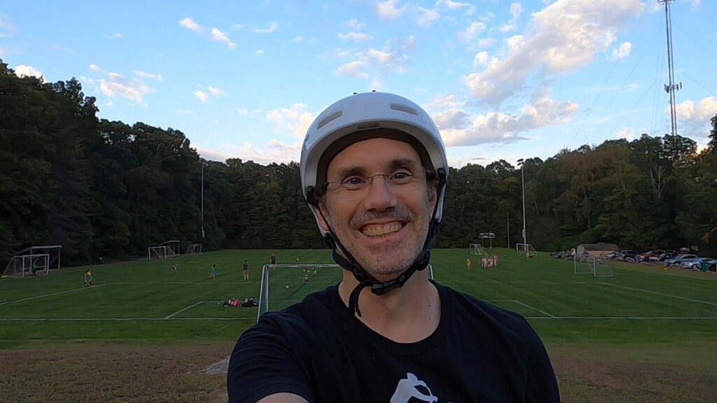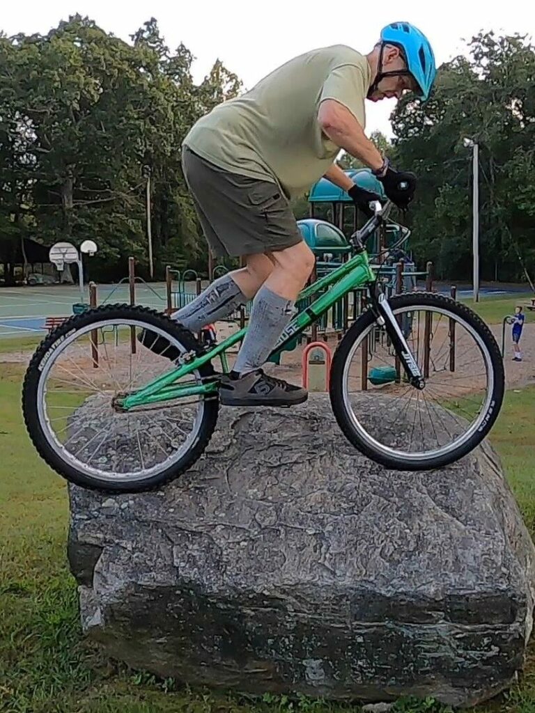Ryan had to work late, so he arrived a little late. Before he showed up, Jim, Tony and I had a bit of an extended warmup on a couple rocks in the corner of the parking lot. It was still pretty quiet then – none of the soccer crowd had arrived yet. That was a fun time. While the riding was a bit of a challenge – due to a combination of tricky lines, being a bit rusty, and not having warmed up yet – it was a fun time, with lots of humorous banter. These are some of the times I cherish the most from the group rides. And I’m glad we had the camera rolling for most of that time. Most of it didn’t fit in the group ride highlights video, but was perfect for a separate “behind the scenes” type edit.