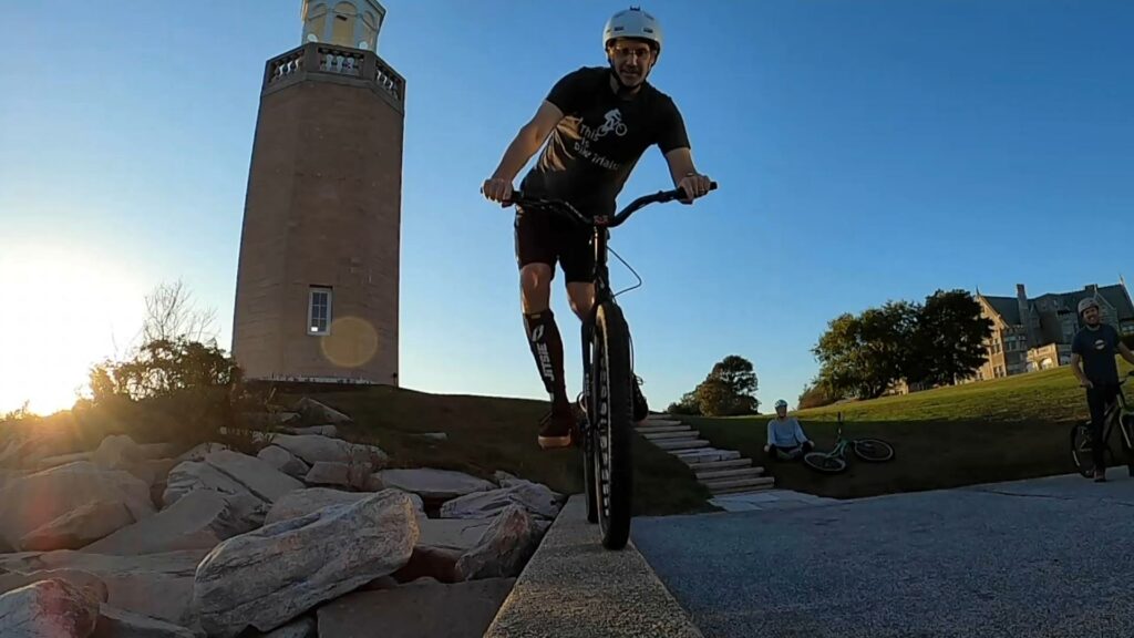 The next spot was on another giant ledge rock near the water. On this spot, we also had plenty of rollups and pedalups, as well as some fails and shenanigans. Tony had “the stupidest line ever” and later spent some time “sitting around” and saluting us. Ryan dominated the “ground is lava” lines through the rock garden. And we threw ourselves repeatedly at some bigger “ups”, after which Ryan proved that this was not “long bike territory.” But before leaving, we wanted to hit up one last spot near the lighthouse.