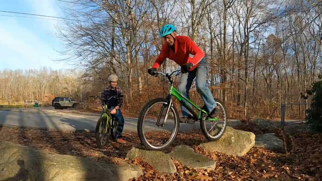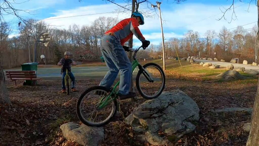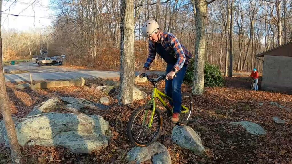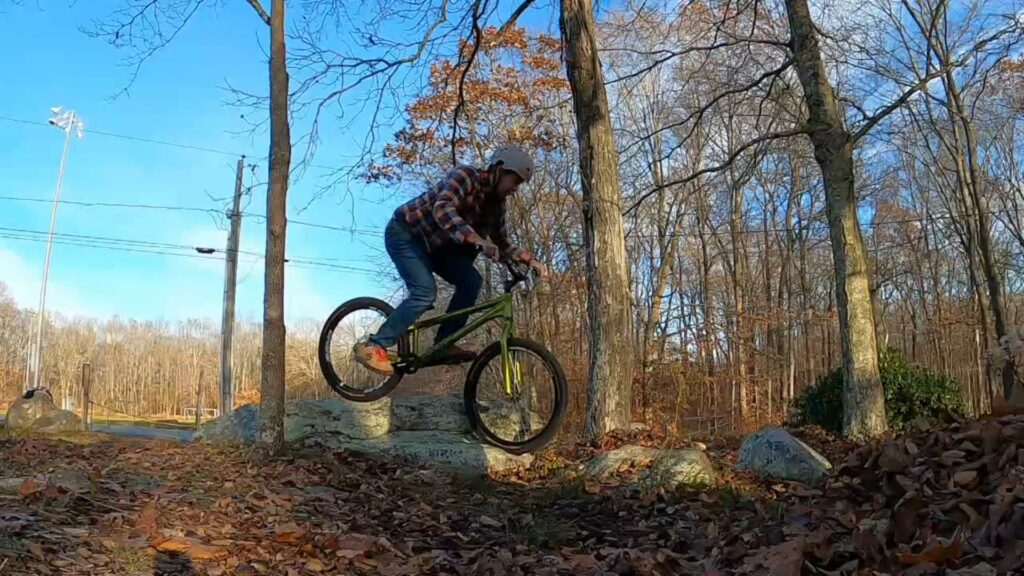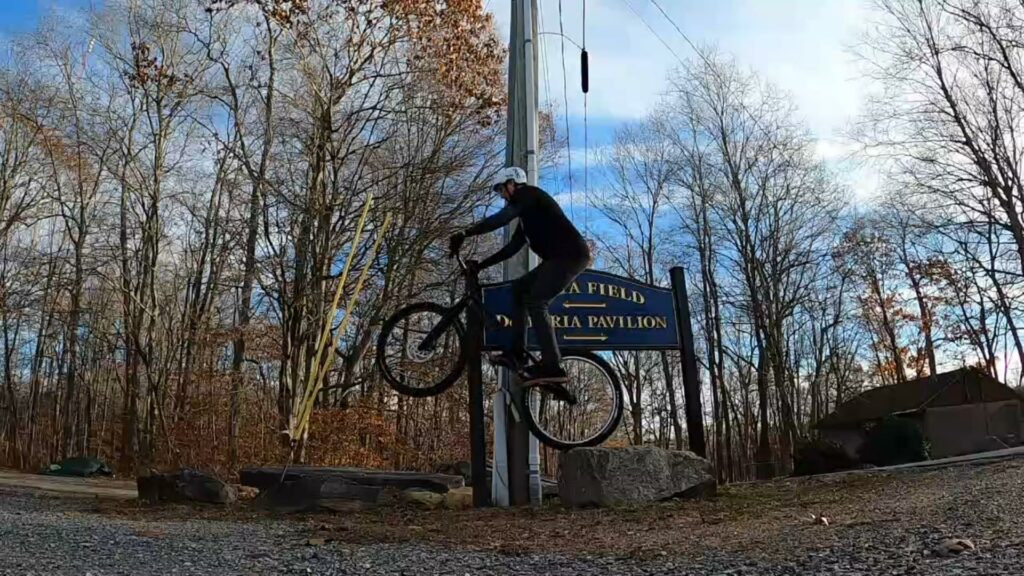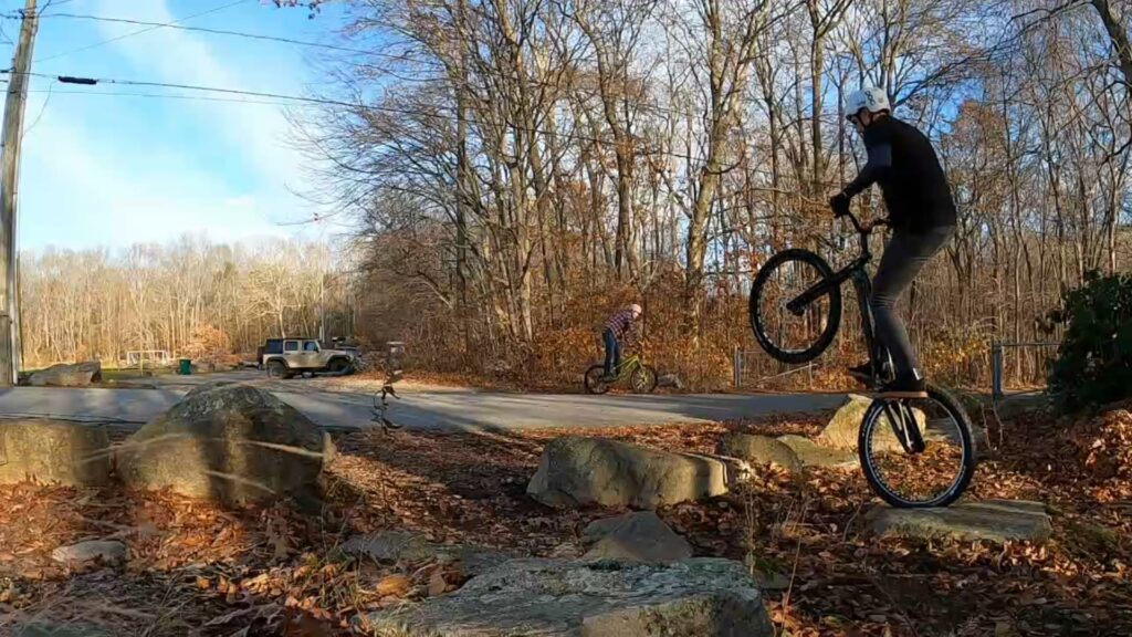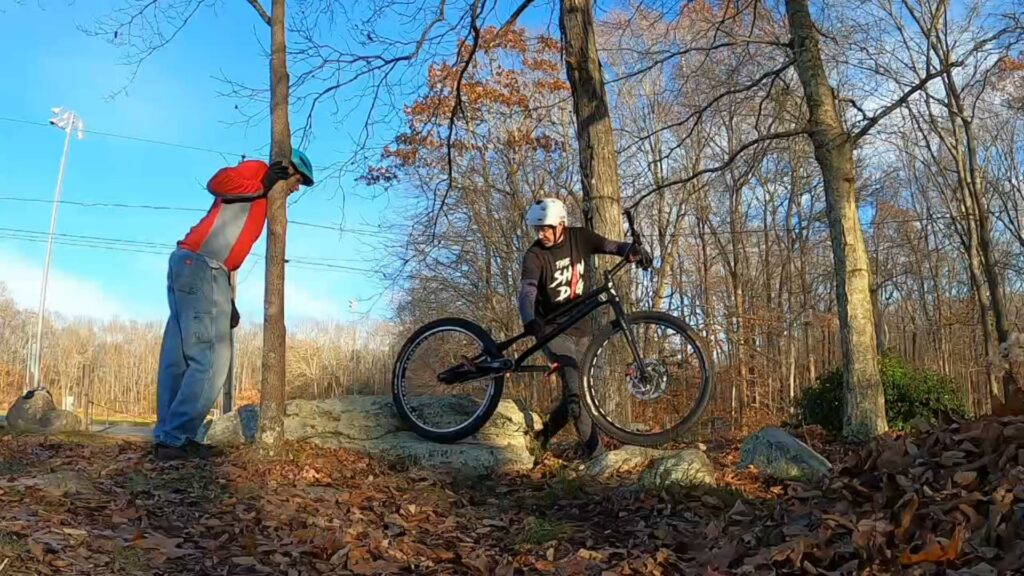 We only ended up riding about maybe two hours, and really only rode a handful of different lines. Ryan and I started on the “horseshow of death” area, mostly trying to get up onto a rock and drop gap down. Meanwhile, Jim raked some leaves away from some of the rocks across the street (you can hear him raking in the background during the beginning of the video).