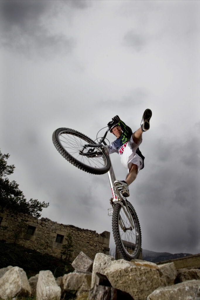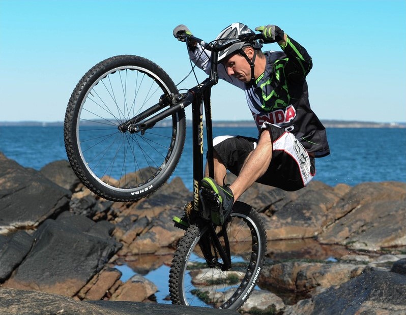 I grew up in a small town where we all just rode our bikes to school and afterwards would go ride around town and just mess around and do little jumps and such. There was also some good mountain biking trails nearby that we would ride. I was never the fastest, but always was good at getting over the log in the trail or through a technical section. There was a local bike shop that had a few rocks in the back of the parking lot and one day one of the mechanics named Lawrence was riding on a Monty Trials bike, one of the ones with the old-school motorcycle tire and triple clamp fork. He then told us about a competition coming up and I entered that and won first place in the beginner category. I was pretty pumped on that and I think I got $20 cash for the beginner class but at the time that was double my allowance. A few months later I went to another Trials competition at the Jackrabbit Run mountain bike race in Norwalk, Connecticut and Hans Ray was there doing a demo. I got to watch his show and heard the announcer telling about how he has traveled the world and how he had been flown in from California and thought it was really cool. That same day I met Jeff Lenosky, who was also there, and he was the rider who won the pro category that day. At this point, I was fully hooked and just started practicing every day and then from there my trials career and love of riding took off.
