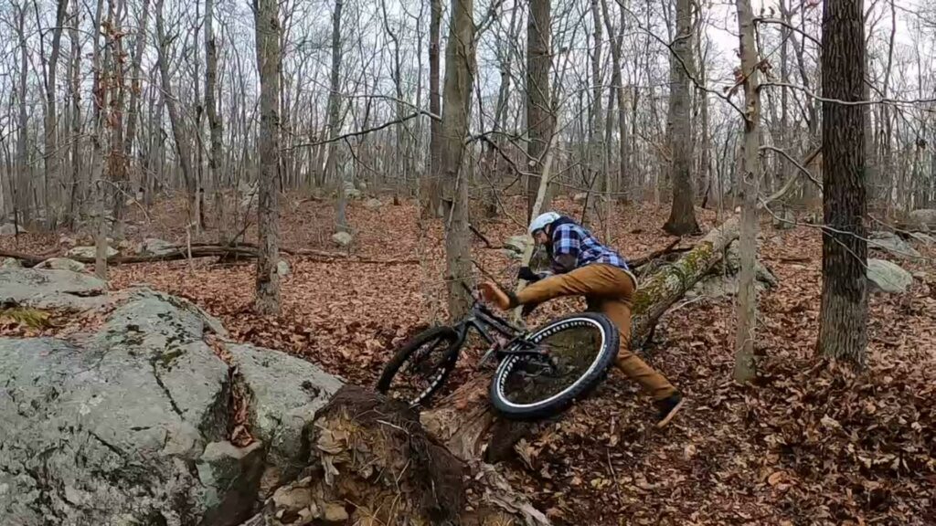 Once we arrived at the spot we planned to ride, we immediately noticed that Mother Nature had provided us with a new feature! A tree had fallen across one of the typical rock roll-up lines. We’ve ridden this spot many, many times over the years. Despite still being fun after so many times riding it, having new challenges is a bonus!