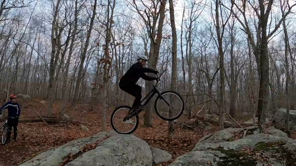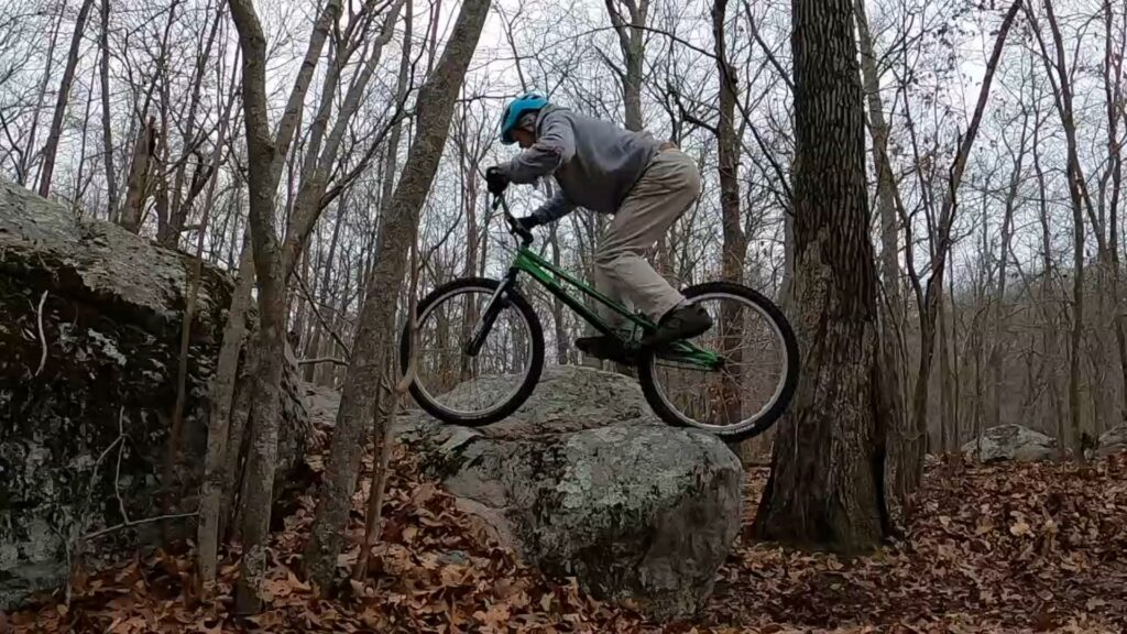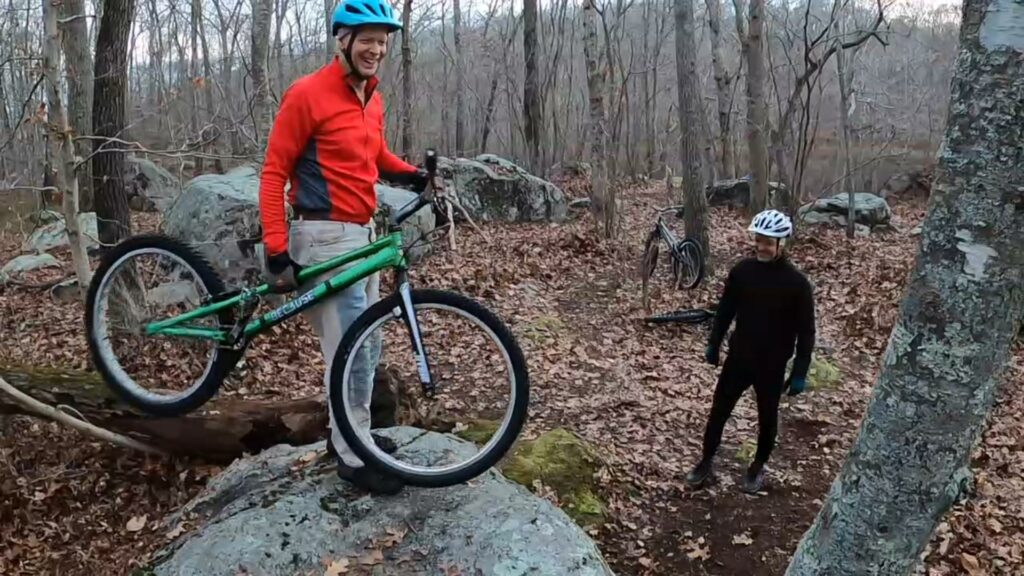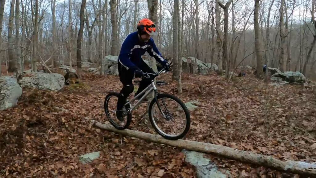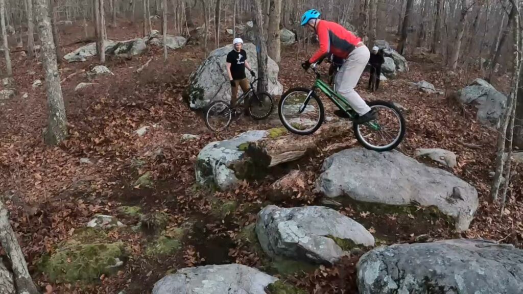 Tony and I started out trying to get up over the log onto the boulder ledge. I just didn’t have the mojo that day. And it’s actually tougher than it looks. The ground is soft and spongy, with occasional (sometimes hidden) little rocks and various imperfections, making the runup less than ideal. I didn’t have the “oomph” to do it static, and couldn’t get the runup figured out to do a pedalup. Tony, on the other hand, nailed it on the second or third try.