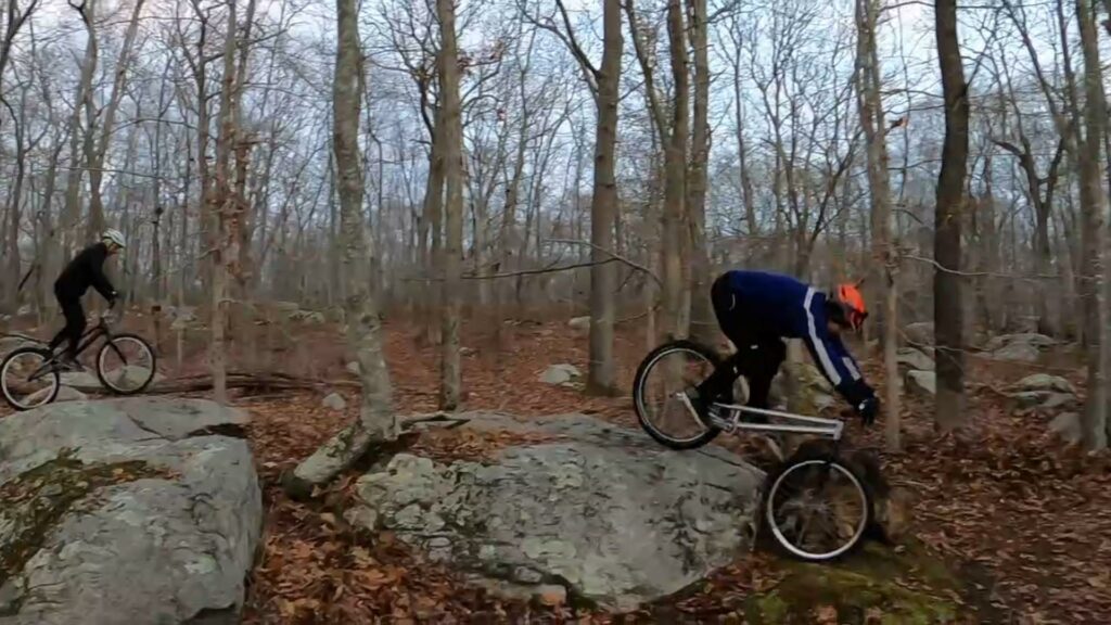 This location has several spots throughout the trails that offer good places to ride trials. In the summer, when the afternoons are longer, we usually session several spots for each ride. Lately when riding here, we’ve been sticking closer to the parking area. But this time we wanted to go further back to an area that provides a trials playground with a bunch of different opportunities for all sorts of lines.