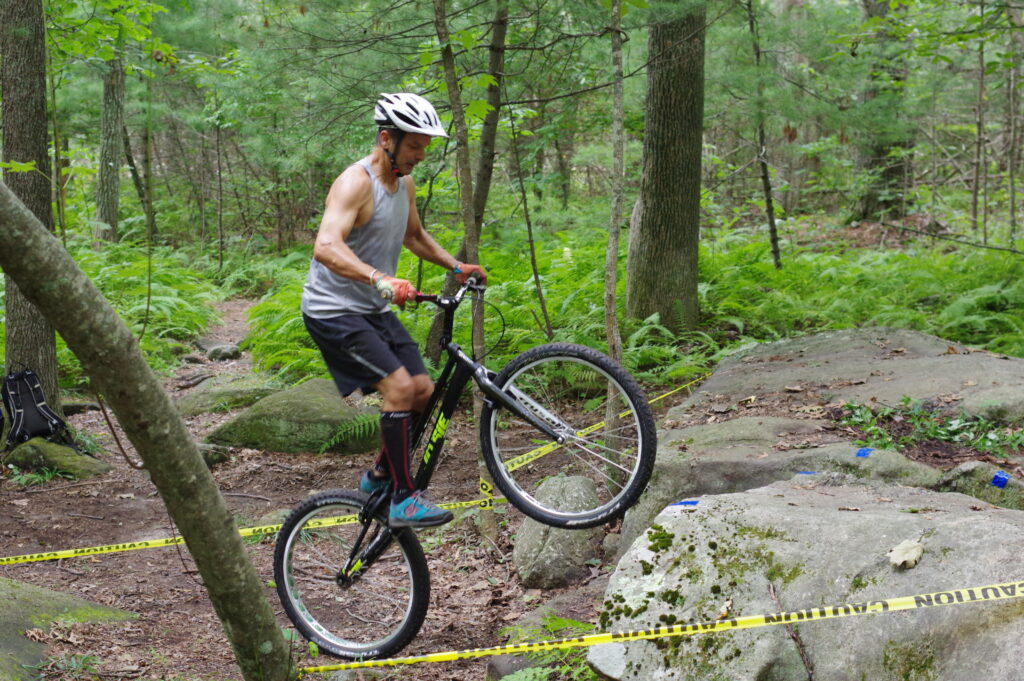 I refer to Tony as our “ringleader,” since he’s been instrumental in organizing group rides and trials competitions for years in Southeastern, CT. He loves bringing new riders into the group, and never hesitates to offer coaching and support – whether for learning to ride or hosting a comp. Tony also brings plenty of humor to every ride; you’ll see some of that shining through in his interview responses.