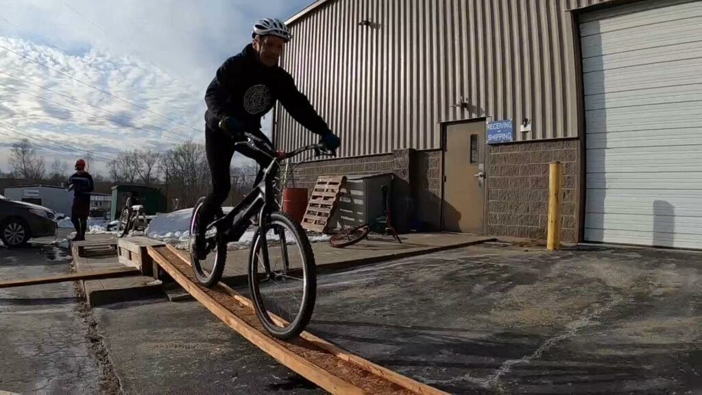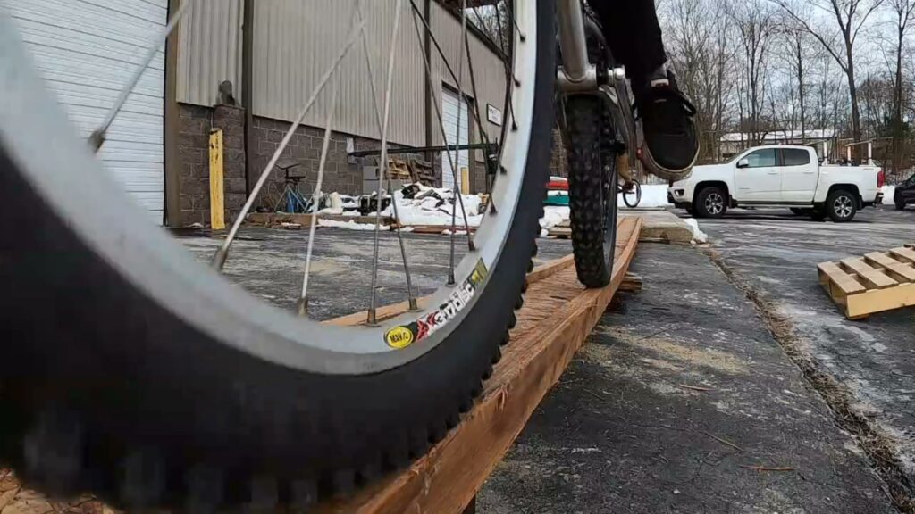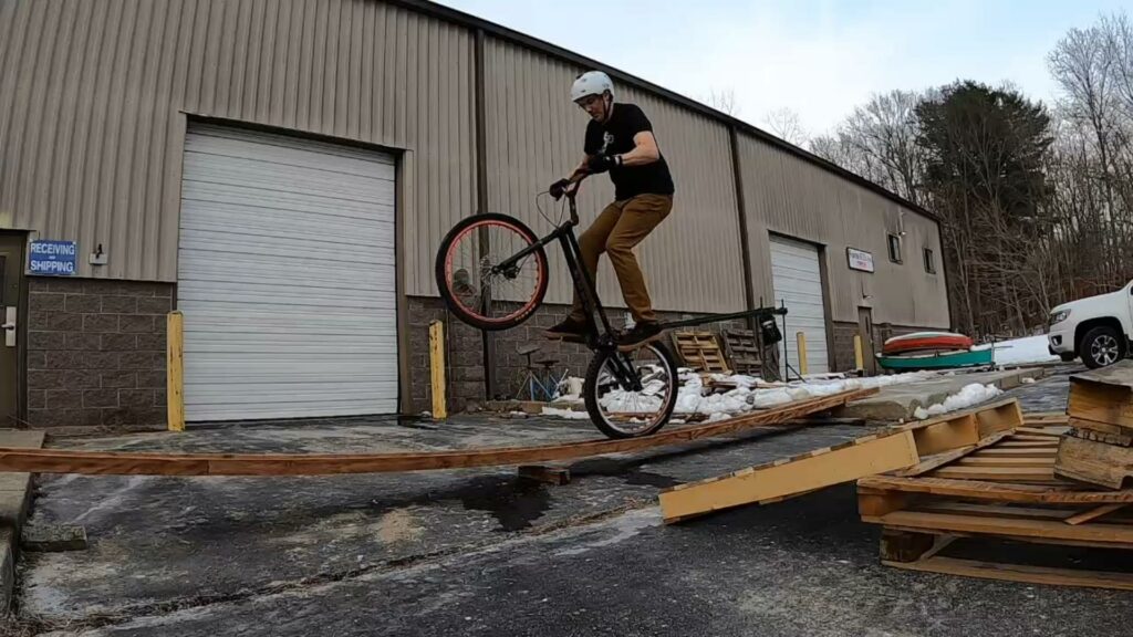 What I wanted to do is go halfway across the bouncy skinny, go to rear wheel, pivot 90 degrees, then gap to a nearby stack of pallets, then ride over the stack. I didn’t realize that the skinny beam could spring back faster than I can hop, so it essentially “sticks” to your wheels. So of course the first few attempts were just silly. And as a result, everyone else wanted to try it: “Hahaha, that was ridiculous. I’ll bet I can do it!”