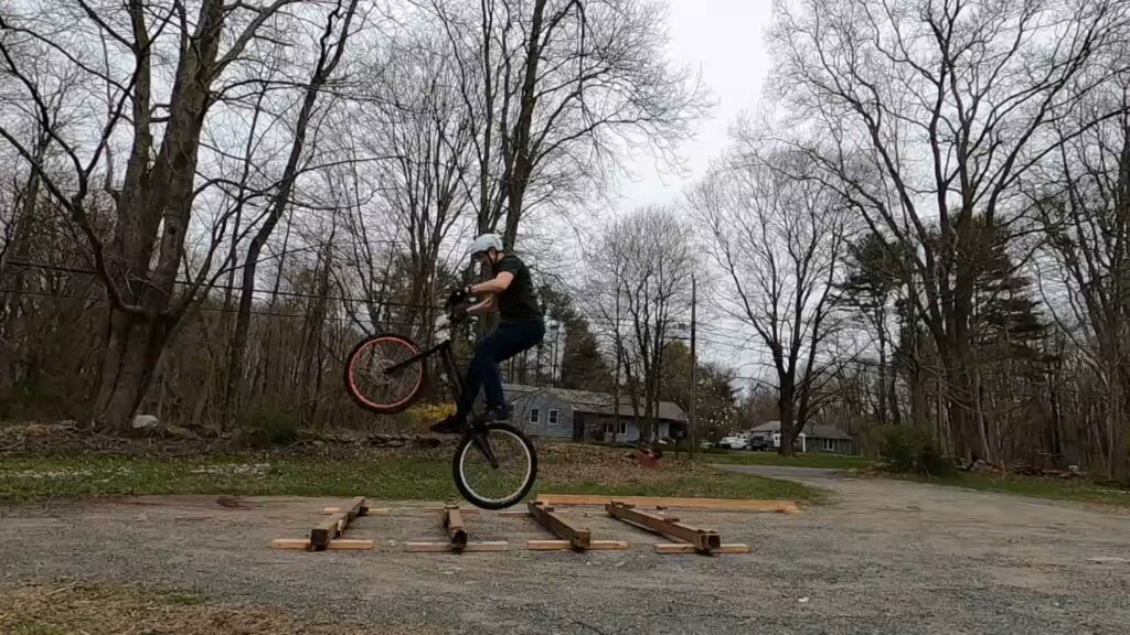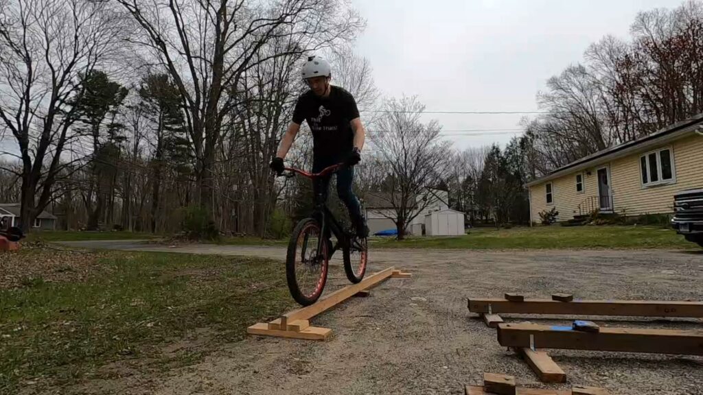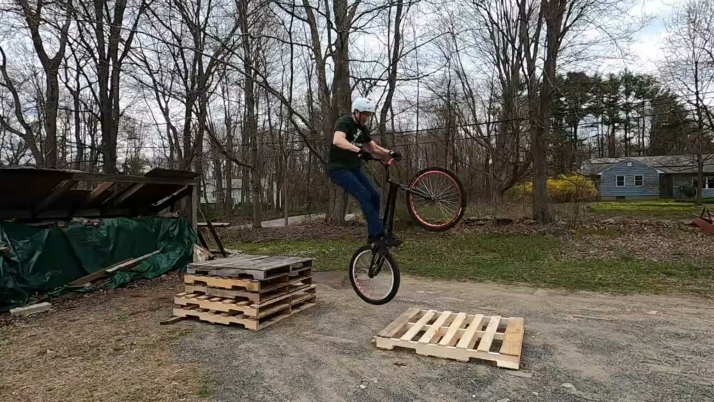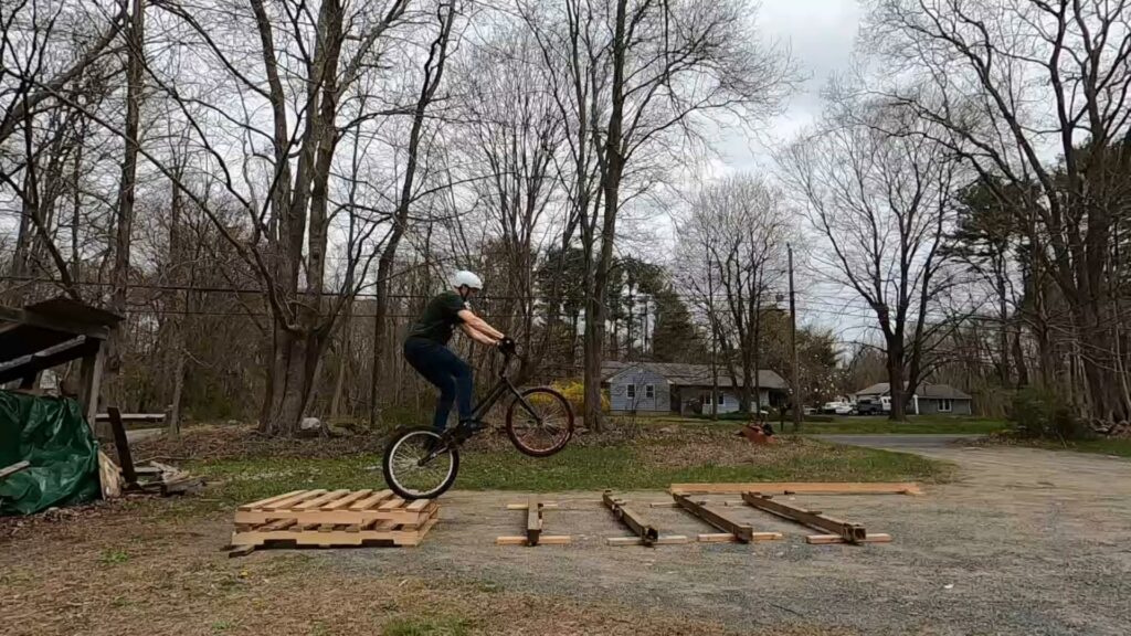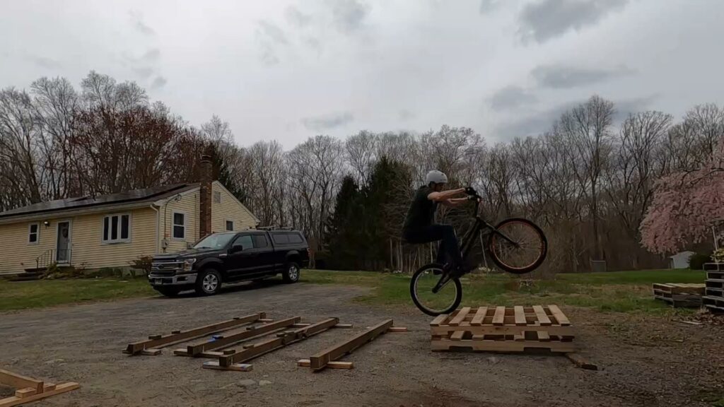 Since I’d been planning to build the skinny beams from my son’s old playscape, I’d wanted to use them to create some “rail gap” lines as well as using them for skinnies. I finally had the opportunity a couple weeks ago. The goal was to rear wheel hop across 4 rails. But then I decided it needed a bit more, so I added a stack of pallets at one end. But of course you can ride the line in either direction!