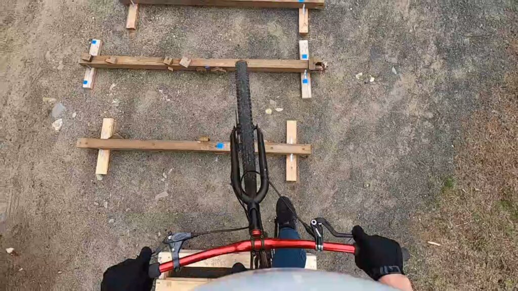 I found that dropping from the pallets and then riding across the 4 rails, while challenging, was still easier than going in the other direction. After many tries gapping the rails and then up onto the pallet stack, I could not quite keep it on the rear wheel the entire way from end to end. It was so close though!